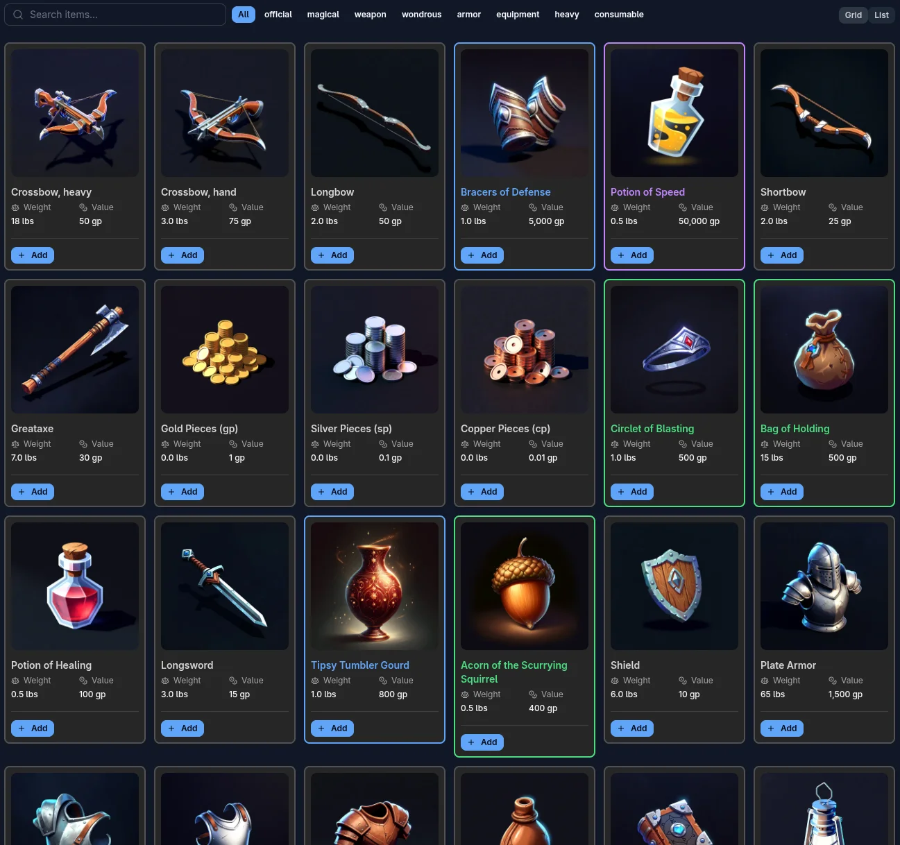 Campaign starter kits, themed treasure sets, or city shop catalogs. Duplicate and customize.